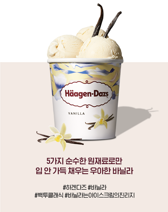 식사 후 디저트로도, 간식으로도 언제나 환영받는 하겐다즈의 바닐라 아이스크림입니다. 어떠한 인공 색소도 사용하지 않고 오직 최상급의 마다가스카르산 버번 바닐라 빈을 사용해 섬세한 맛과 향을 만들기 때문에 안심하고 드실 수 있어요. 바닐라 특유의 우아한 맛과 부드러운 달콤함이 식후 입안을 깔끔하게 정리해주고 여러분을 행복하게 만들어줄 거예요. 순수하고 달콤한 크림과 바닐라가 완벽하게 어우러진 하겐다즈 바닐라로 입안 가득 탁월한 맛과 달콤한 향으로 채워보세요.