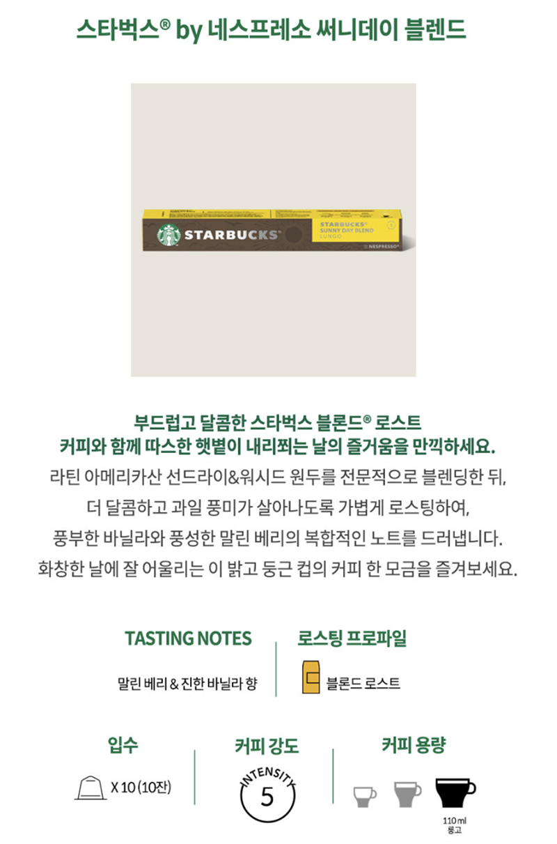 네스프레소 스타벅스 써니데이 블렌드 5.6g*10개입 NESPRESSO Ca phe may Capsupe - Starbucks Sunnyday Blend Lungo 5.6G*10EA