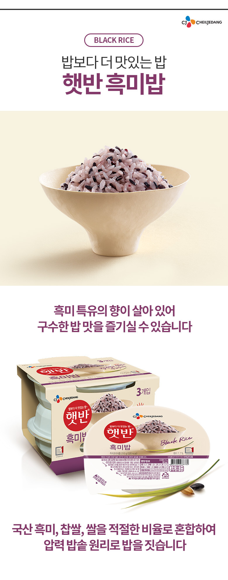 CJ 햇반 흑미밥 210g 3개입 CJ Com gao nep than an lien set 3